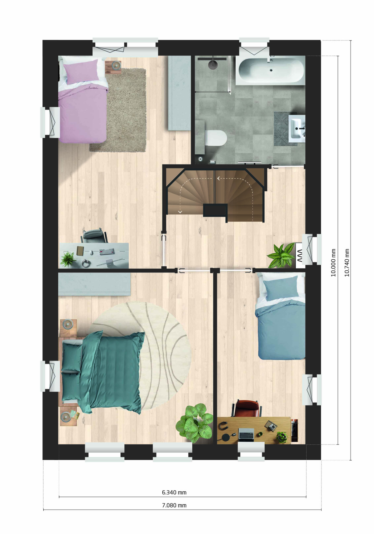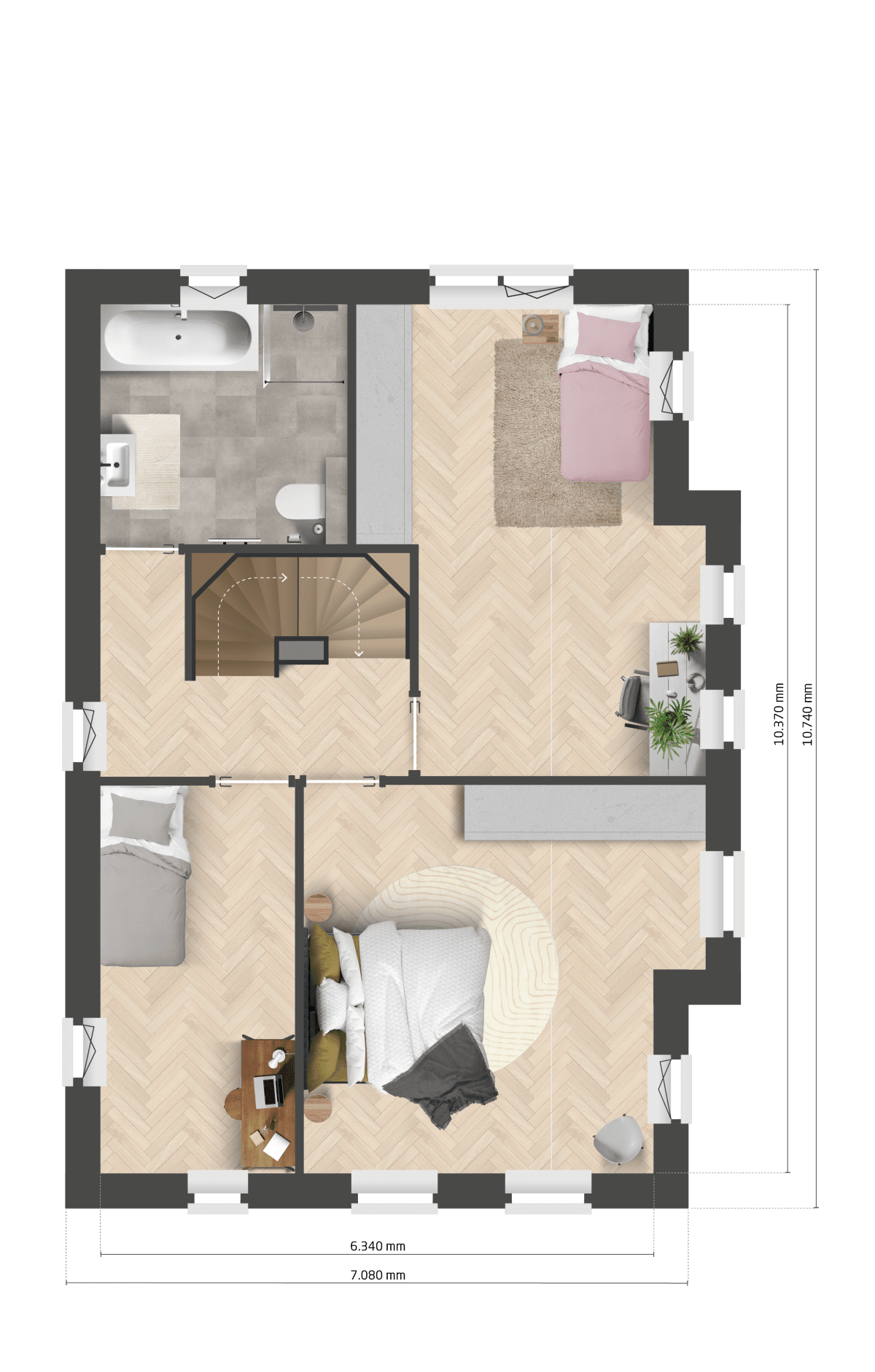 De eerste verdieping van deze woning heeft drie slaapkamers en een moderne badkamer met een ligbad, een douche, een wastafel en een tweede wandcloset. De zolder is een ideale plek voor een speelruimte voor de kinderen, een handige werkplek of extra slaapkamers. Hier vind je ook de aansluiting voor de wasmachine en een aantal van de technische installaties. Heb je eigen wensen? Geen probleem! Laat je verrassen door onze flexibiliteit en schroom niet om jouw eigen ideeën bij ons kenbaar te maken.