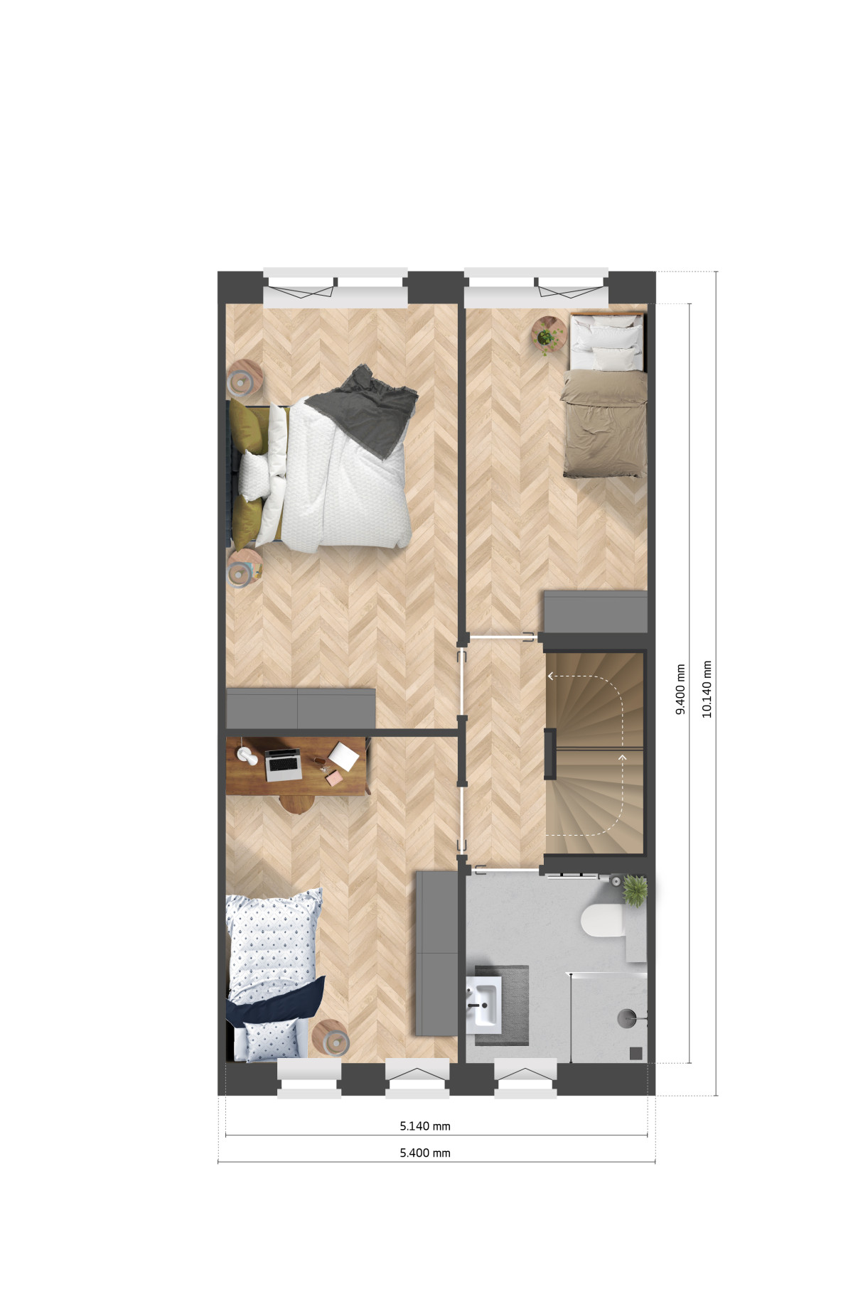 De eerste verdieping van deze woning beschikt over drie slaapkamers en een badkamer met een douche, een wastafel en een tweede wandcloset. Wil je iets wijzigen op de verdieping? Laat het ons weten! Op zolder staan de technische installaties. Hier is ook de aansluiting van de wasmachine en zou je een wasdroger, opbergkasten en een strijkplank kwijt kunnen. Daarnaast kun je optioneel kiezen voor bijvoorbeeld nog een extra hobbykamer. Heb je eigen wensen? Geen probleem! Laat je verrassen door onze flexibiliteit en schroom niet om jouw eigen ideeën bij ons kenbaar te maken.