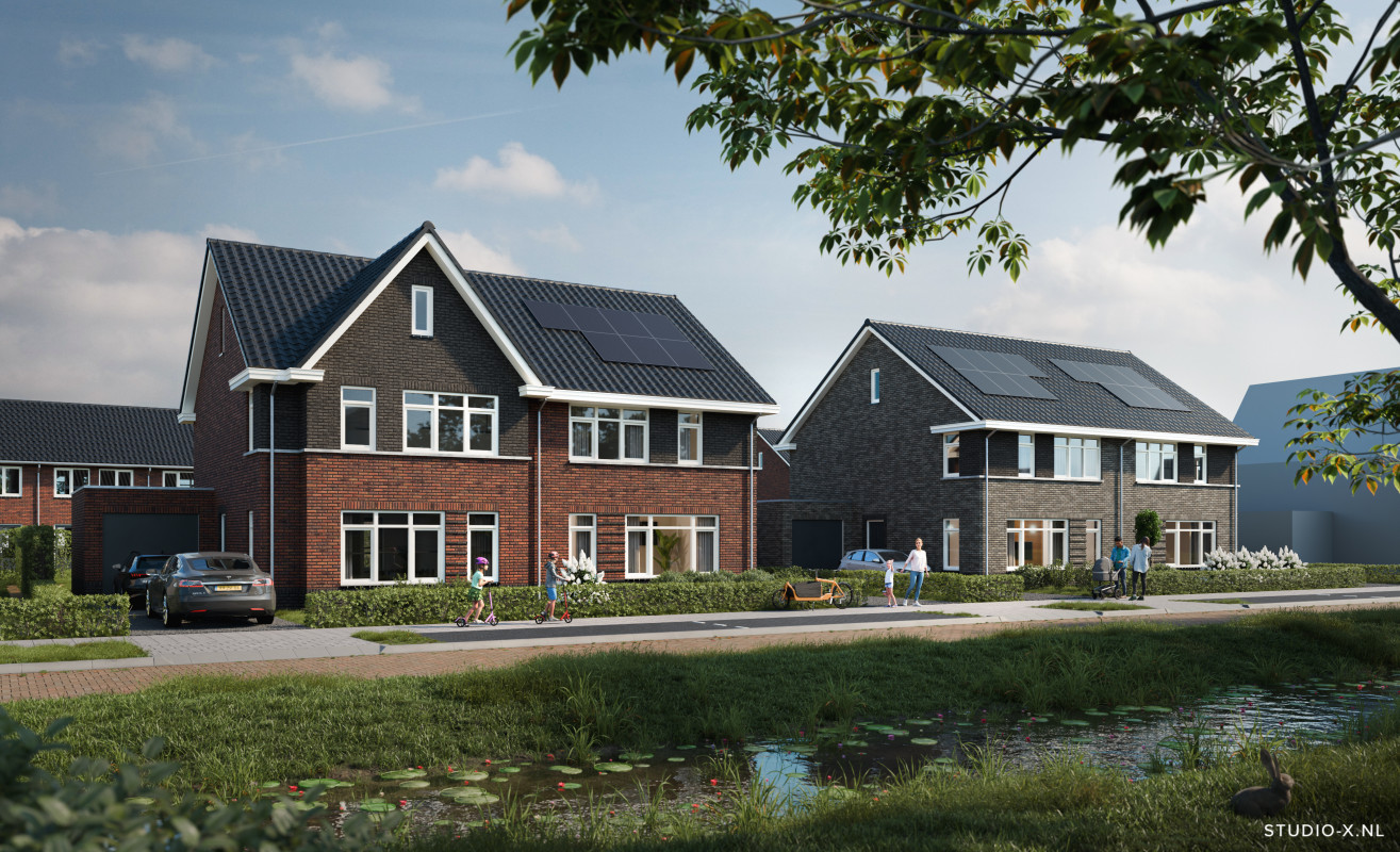 - Inclusief twee parkeerplaatsen op eigen terrein bij de twee-onder-een-kapwoningen en de hoekwoningen (met uitzondering van woningmodel Hoflyck, dit woningmodel heeft 1 parkeerplaats op eigen terrein).
